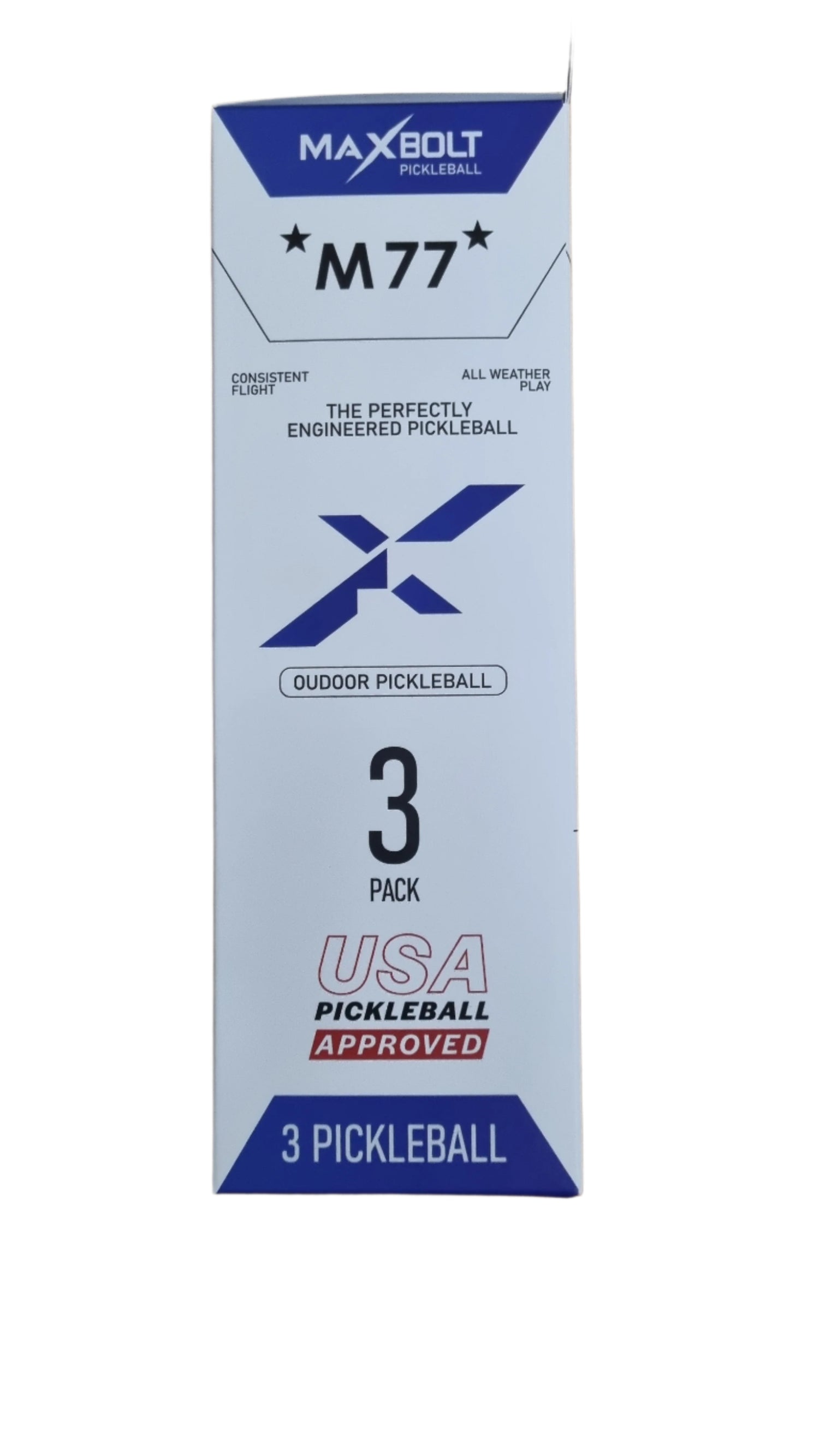 Maxbolt M77 is a USAPA-approved pickleball ball for tournament use. It incorporates the Aero Flight Design, which reduces drag and increases ball speed. As a result, you can hit the ball earlier and surprises your opponents