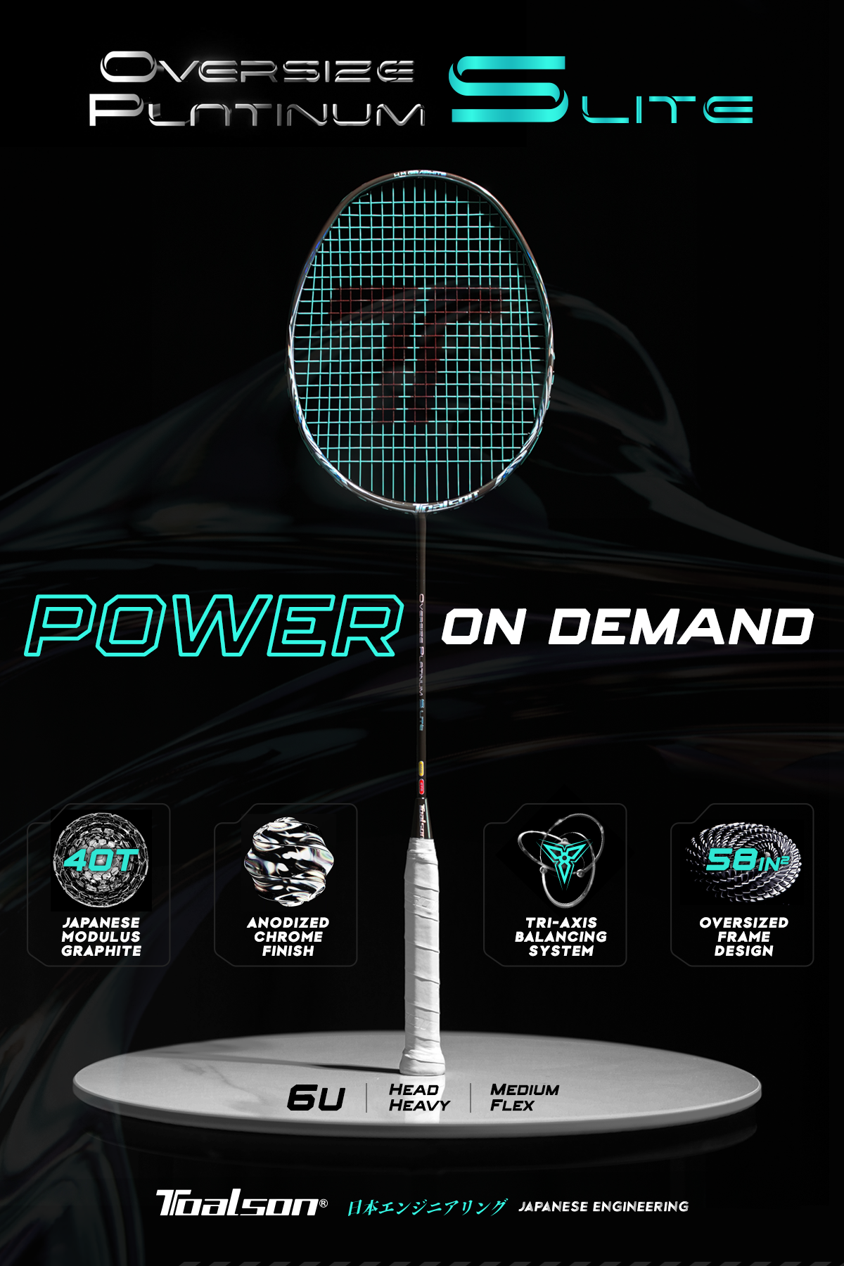 Toalson Oversize Platinum generates exceptional speed due to a number of reasons. First, it has a very light frame, weighing a mere 73g on average. Second, its even balance makes the racket feels lighter than its actual weight. It is easy to swing and change your strokes. Third, it has a slim tapered shaft of 6.5mm to 7.0mm, which is slimmer than many tapered shafts in the market.
